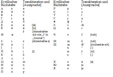 Transliteration der slawischen kyrillischen Buchstaben: